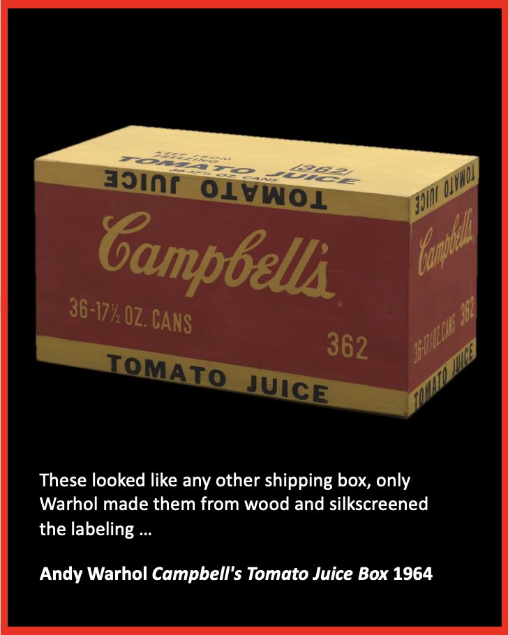 And even the packing cases became important, whether in Warhol’s hands; he reproduced them as one-of-a-kind art, or from Mattel; who created them as mass produced cardboard shipping boxes, (which would have generally been thrown in the trash, so few remain making them fairly rare and very collectible.