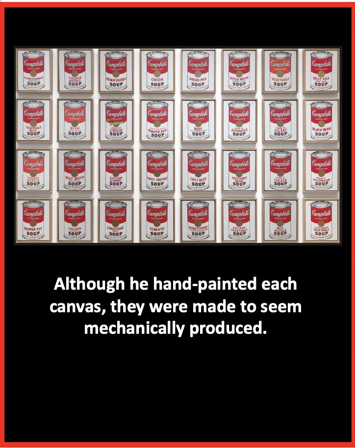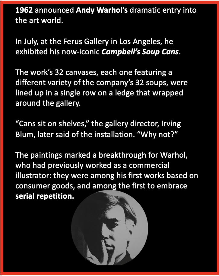 And a sidestep to Warhol, because I am an “Andy” fan (I always think of this image when I see Campbell’s) who turned the humble Campbell’s Soup can into art.